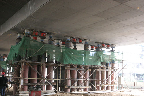 據(jù)工程監(jiān)理方濟(jì)南金諾監(jiān)理工程師宋海濤介紹說,西側(cè)三聯(lián)橋體已于去年的十二月底頂升到位,而隨著東側(cè)三聯(lián)橋體的頂升到位,燕山立交和二環(huán)立交將實(shí)現(xiàn)全面對接。東側(cè)170米的橋面共有9排橋墩,每排根據(jù)橋墩數(shù)量的不同共安放75臺(tái)千斤頂,承擔(dān)了東側(cè)橋面6000噸的重量。而最大抬升高度為4.139米。從抬升重量和高度來說,在全國都是第一位的。