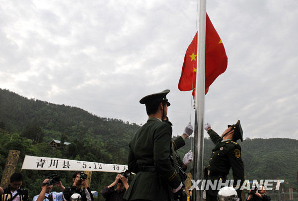 5月12日,青川縣汶川大地震一周年紀念活動上舉行升旗儀式。
