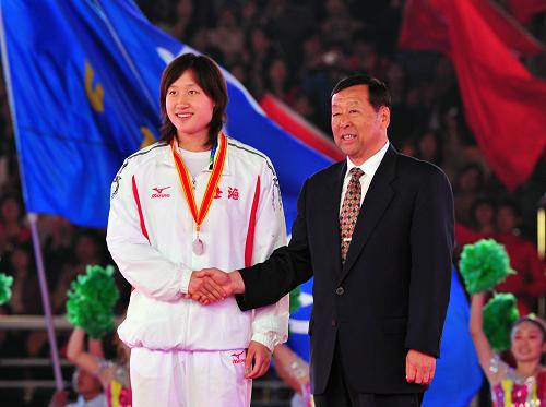 游泳運(yùn)動(dòng)員劉子歌(左)在閉幕式上領(lǐng)獎(jiǎng)。