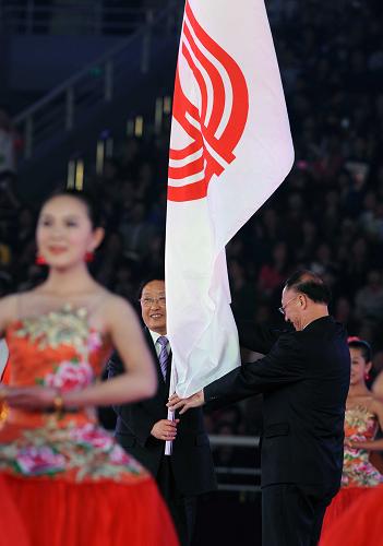 國家體育總局局長劉鵬(右)將中華人民共和國運動會會旗交給遼寧省省長陳政高。