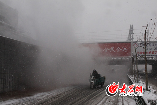 12日上午,歷山路上一處暖氣管道漏水,熱氣騰騰嚴重影響了行人及車輛的視線。
