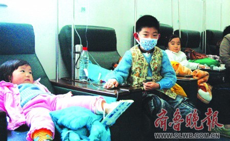18日,濰坊市人民醫(yī)院,一名輸液的患兒戴上了彩色口罩防控甲流。甲流疫情暴發(fā)后,人們防范甲流的意識日漸增強(qiáng)。醫(yī)生說,戴口罩是防范甲流的一種有效辦法。