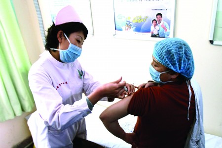 4日,在青島市中心醫院,一線醫療衛生人員正在接種甲流疫苗。隨后,將有包括交通系統關鍵崗位的公共服務人員、維護國家安全穩定的公安干警及處置突發事件等任務的警務人員等5個接種甲流疫苗的重點人群陸續接種。