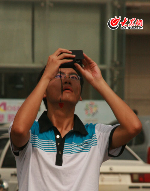 大眾網(wǎng)濟(jì)南7月22日訊(記者 趙爾印 陳宏發(fā) 實(shí)習(xí)生 王磊) 墨鏡、墨水盆、X光片、膠片、電焊濾光玻璃、專業(yè)濾鏡……今天早上,濟(jì)南的大街上到處有都觀看日食的市民,但并不是每個(gè)人都戴上專業(yè)觀測(cè)眼鏡,大家各出奇招看日食,既飽嘗了這場(chǎng)世紀(jì)天文盛宴,又節(jié)省了成本,一舉兩得。