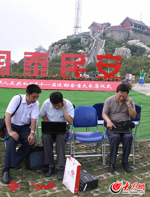 7月31日,全運會圣火采集報道組提前來到泰山之巔,同時趕到的是聯通泰安分公司工作人員。為了這次圣火采集直播,泰安聯通移動建設部、產品創新中心、設備中心三個部門全部派出骨干力量上山調試網絡。移動建設部宋慶杰主任帶領近十名工作人員來到圣火采集儀式現場,工作人員打開3G無線上網本進行調試,產品創新部劉倫主任和郭冠軍、李新春在整個直播期間一直在記者直播處附近,隨時待命處理突發事故,但網絡一直處于暢通,并沒有出現任何狀況。