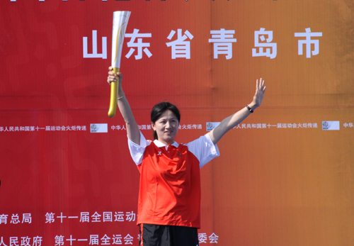 (特派記者 馮煒程 楊博)全運會圣火傳遞山東第一站,青島站的傳遞19日上午9點在奧帆中心啟動,張娟娟成為第一棒火炬手。目前火炬傳遞正在進行。圖為張娟娟展示火炬。