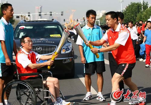 濰坊市委書記張新起將火炬交到市體育局局長耿文手中。