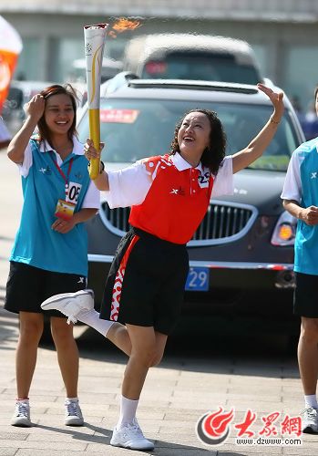 山東省呂劇院高靜擺出各種戲劇中的造型,為這次火炬傳遞增色許多。