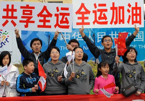 10月8日,聊城市民為火炬傳遞活動助威加油。當日,第十一屆全國運動會火炬傳遞活動在山東聊城進行。