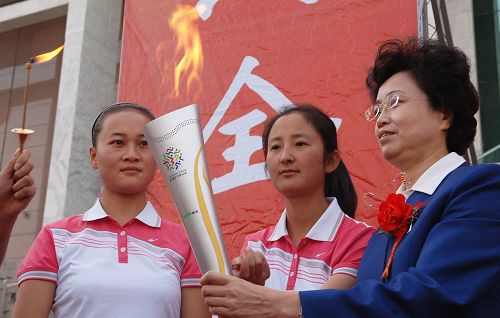 青海省省長宋秀巖(右一)手持被點燃的火炬。
