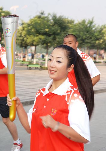 火炬手、全國健身小姐冠軍邱亞娟在進行傳遞。