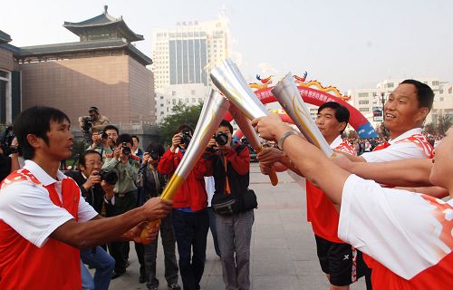 火炬手馬海軍(左)點燃另外三名火炬手手中的火炬。