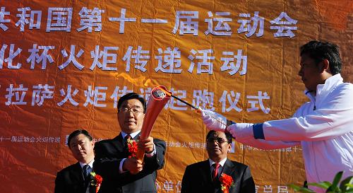 在西藏自治區(qū)黨委常委、拉薩市委書記秦宜智致辭之后,一位圣火護(hù)衛(wèi)隊(duì)員從火種燈中引出火種,點(diǎn)燃了西藏自治區(qū)黨委書記張慶黎手持的火炬。張慶黎在展示之后,將火炬?zhèn)鬟f給西藏自治區(qū)體育局局長德吉卓嘎,德吉卓嘎隨后將火炬?zhèn)鬟f給西藏第一棒火炬手、著名射箭運(yùn)動(dòng)員多吉秋云。多吉秋云點(diǎn)燃了其余四名火炬手手持的火炬,張慶黎宣布:中華人民共和國第十一屆全國運(yùn)動(dòng)會(huì)中國石化杯西藏自治區(qū)拉薩火炬?zhèn)鬟f活動(dòng)現(xiàn)在開始。