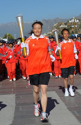 火炬手、著名登山運(yùn)動(dòng)員吉吉(前)在火炬?zhèn)鬟f中