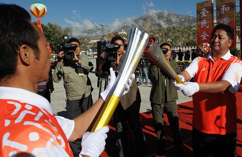 火炬手多吉秋云(右)和扎西在進(jìn)行火炬交接