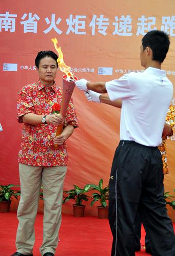 在經(jīng)歷熱帶風(fēng)暴“彩虹”之后,當(dāng)日的海口格外晴朗。火炬?zhèn)鬟f起跑儀式上,海南省省長羅保銘將海南省代表團(tuán)團(tuán)旗授予代表團(tuán)團(tuán)長林方略,并將點(diǎn)燃的“如意”火炬?zhèn)鬟f給海南省文體廳廳長范曉軍。隨后,九運(yùn)會(huì)帆板冠軍王麗芳接過火炬,與中國石化海南公司全國勞動(dòng)模范陸建平、群眾體育先進(jìn)工作者馮川建共同順利完成了火炬?zhèn)鬟f。