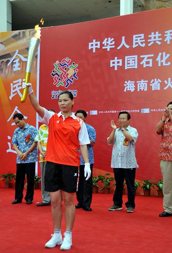 9月11日,九運(yùn)會(huì)帆板冠軍王麗芳擔(dān)任全運(yùn)會(huì)火炬?zhèn)鬟f海口站第一棒火炬手。當(dāng)日,以“祝福祖國,共享全運(yùn)”為主題的第十一屆全國運(yùn)動(dòng)會(huì)火炬?zhèn)鬟f活動(dòng)海南省火炬?zhèn)鬟f起跑儀式在海口市舉行。 新華社記者周慧敏攝