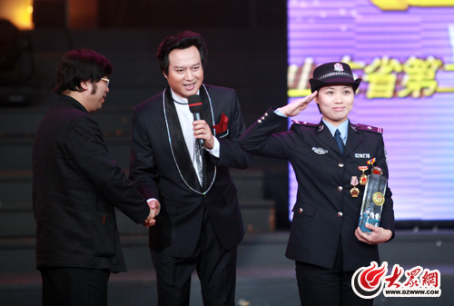 山東省美術家協(xié)會副主席、著名畫家孔維克(左)為“十佳民警”邊曉燕頒獎(曹亮 攝影報道)