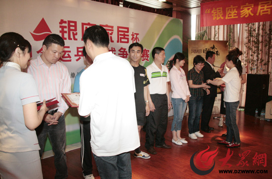 銀座家居國(guó)際時(shí)尚生活廣場(chǎng)總經(jīng)理王曉琳與圣象山東公司副總經(jīng)理沈仲為獲獎(jiǎng)球隊(duì)頒發(fā)證書(shū)
