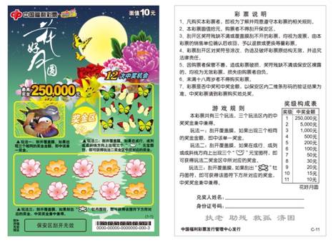 小小一張彩票,傳遞淡淡馨香,寄托的或是濃濃鄉(xiāng)愁,也許又是美麗的夢(mèng)想,抑或又是甜甜的愛(ài)情,真誠(chéng)的節(jié)日祝愿……拿起一張“花好月圓”,只見(jiàn)皓月當(dāng)空,繁星點(diǎn)點(diǎn),牡丹飄香,鴛鴦結(jié)伴,彩蝶紛飛……這就是中秋專(zhuān)題彩票“花好月圓”精美的票面元素。該款彩票清新脫俗的設(shè)計(jì)風(fēng)格開(kāi)創(chuàng)了刮刮樂(lè)票面設(shè)計(jì)的新思路,明月映彩蝶,光影相映,動(dòng)靜結(jié)合。看著它,就如同想起和心愛(ài)的人兒的花前月下,夜半私語(yǔ),是多么甜蜜多么溫馨。