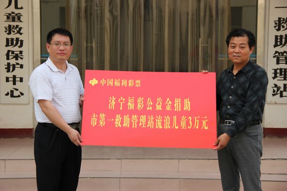 圖為濟寧市福彩中心負責人向濟寧市流浪兒童救助中心捐贈資助金