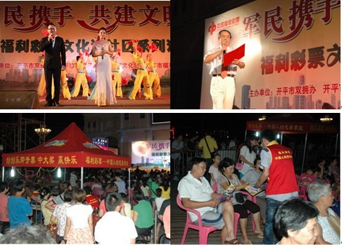 8月5日晚,開平城市廣場響起了紅紅火火的開場歌舞《美麗的日子》,拉開了由開平市雙擁辦、市福利彩票發(fā)行中心和市文化館聯(lián)合舉辦的“軍民攜手·共建文明城市”--福利彩票文化進社區(qū)系列文藝匯演活動的序幕。全場晚會圍繞弘揚中國福利彩票“扶老、助殘、救孤、濟困”的宗旨,喜迎中國人民解放軍建軍86周年的主題,配合開平市創(chuàng)建廣東省文明城市而進行。