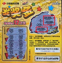 李先生是福利彩票的忠實粉絲,對福彩的玩法都很了解,尤其喜歡刮刮刮樂,所以他對這個票種非常熟悉。他一邊刮獎一邊調(diào)侃:“前四張怎么這么不給力呀,怎么著來個小獎鼓勵一下也不錯啊,總不能啥都沒有吧,要是這樣的話可是有點失望啊。”說話的同時,他也將第五張的玩法一刮開了。三個120000走進了他的眼簾兒,剛開始還不相信,于是,他請銷售員幫忙核實一下。當銷售員拿過獎票后就發(fā)現(xiàn)中獎了:“李哥,恭喜啊,中大獎啦!得請客噢!”李先生滿臉寫著疑問:“真的假的?”“你再仔細看看,玩法一印著三個‘120000’元呢!”等李先生再次核實后才確認自己的確中了頭獎,于是,他激動地說:“得嘞,今晚我請客!”