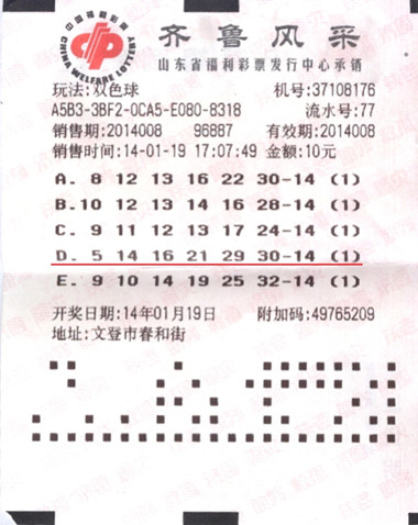 1月19日,李先生來到37108176號站點購買當晚開獎的第2014008期雙色球。在與周圍彩友聊天時,他聽說了雙色球最近打造了一個億元大獎的消息,這讓他十分羨慕、十分振奮。趁著東風好借力,他于是也進行了10元的投注,自選1注,機選4注,并統(tǒng)一將藍球改成了最近大熱的14。當晚雙色球開出號碼“05 14 16 21 29 30+12”,李先生發(fā)現(xiàn)自己機選的一注號碼紅球全部命中,雖然藍球沒有開出14,李先生還是表示十分慶幸,多虧當期追加了4注機選號碼,否則要與二等獎擦肩而過了。