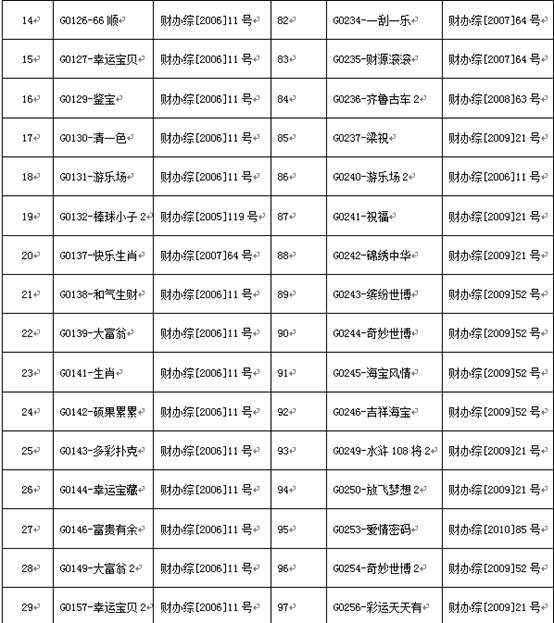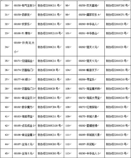 根據財政部《關于停止銷售“勇士闖關4”等136款即開型福利彩票的通知》(財辦綜〔2013〕91號)的要求,中國福利彩票發行管理中心決定: