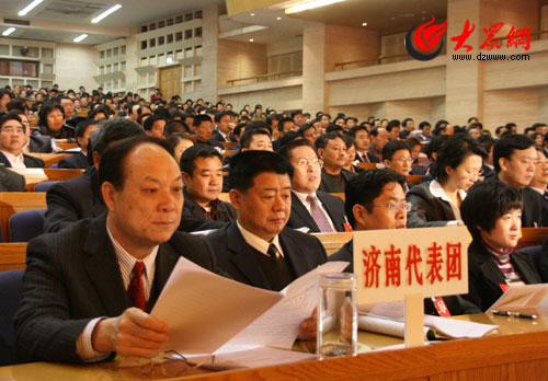 大眾網2月15日訊 今天下午三時,省十一屆人大二次會議舉行第二次全體會議,聽取省人大常委會工作報告和省“兩院”工作報告。圖為大會現場。