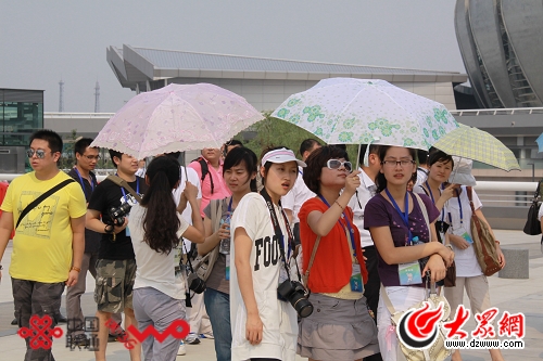美女記者撐傘頂著烈日參觀場館