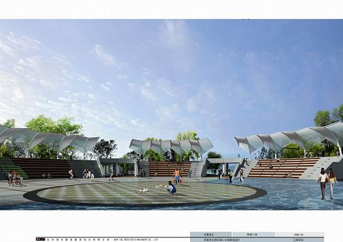 (一)水之門:入口廣場中央設(shè)置“水之門”大型半圓水幕構(gòu)筑物,作為本屆園博會“水=環(huán)境”的象征性形象,水幕上方題“第七屆中國(濟南)國際園林花卉博覽會”,水幕顯示“有朋自遠(yuǎn)方來不亦樂乎”歡迎字體,構(gòu)成具有聚集力量的入口廣場。