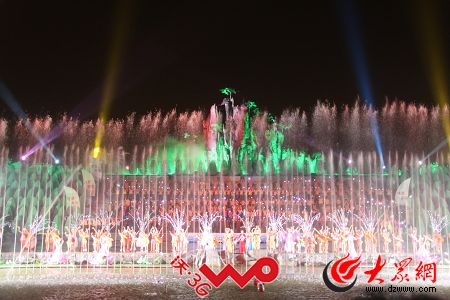 記者在現(xiàn)場(chǎng)看到,演出以噴泉水幕為屏幕,隨著巨大的水幕騰空而起,華美的燈光開始變幻,演員們身著華服出現(xiàn)在6000余平方米的舞臺(tái)上,伴隨著悠揚(yáng)親切的歌聲翩翩起舞。在《沂蒙小調(diào)》歌舞表演之后,《地靈人杰》、《熱土情深》等表演依次亮相,為觀眾們帶來(lái)了一場(chǎng)絢麗壯觀、唯美抒情的視覺盛宴。
