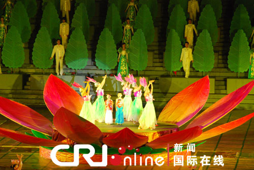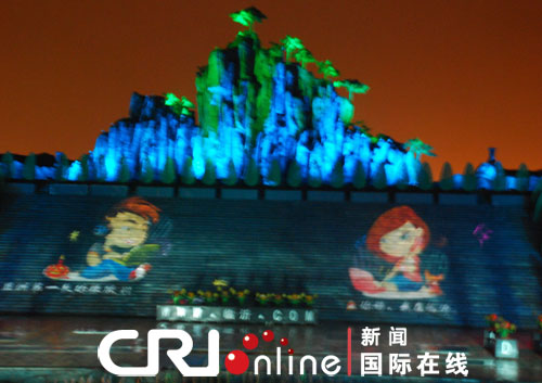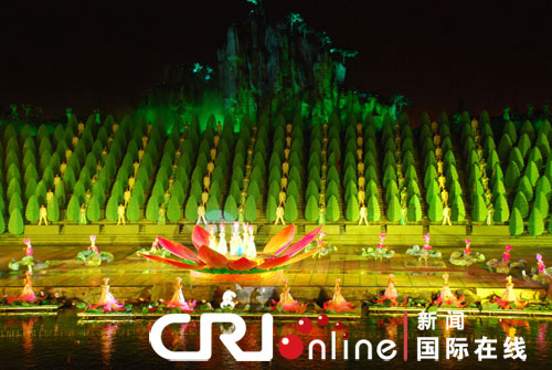 除了精彩的歌舞表演,現場的燈光也十分絢麗,激光燈的編織效果使夜色中的湖心島披上了如夢如幻的色彩。同時,燈光在舞臺上做出的微波蕩漾的藍色水面,更增加了奇妙感。