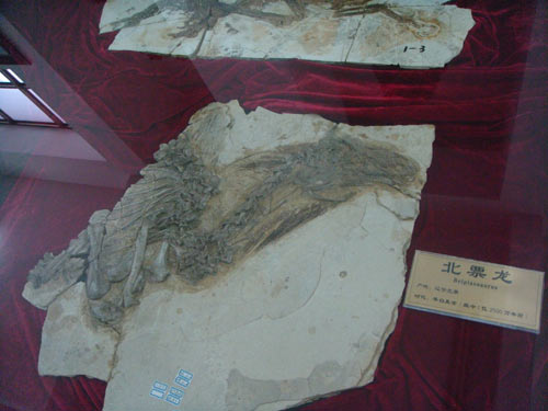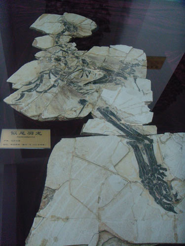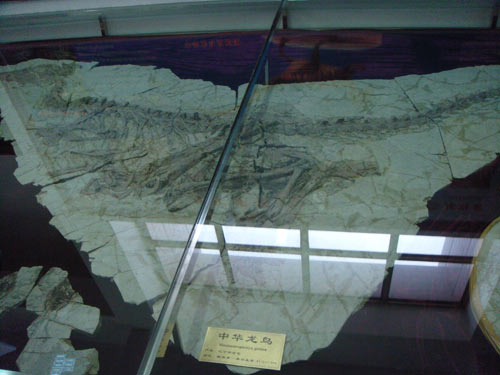 在博物館的眾多古生物化石中,“祖籍”遼寧的館藏占有相當(dāng)?shù)谋壤F渲校钜俗⒛康氖且患L3.8米,高1.5米的中華龍鳥化石。這件化石是迄今為止世界上保存最完整、個(gè)體最大的中華龍鳥化石。于2009年1月載入吉尼斯世界紀(jì)錄為“世界上最大的中華龍鳥化石”。