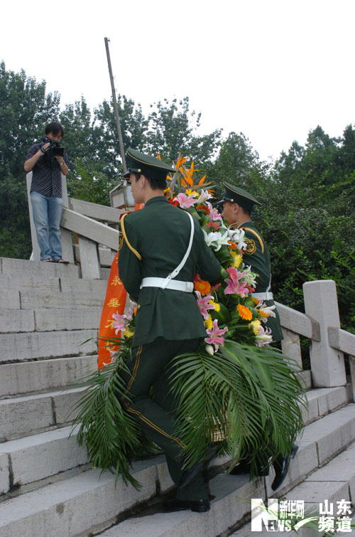 新華網(wǎng)山東頻道8月25日電 (喜娥)24日上午,第五屆中國(guó)網(wǎng)絡(luò)媒體山東行采訪團(tuán)參觀采訪沂蒙精神展,并在華東革命烈士陵園敬獻(xiàn)花籃。