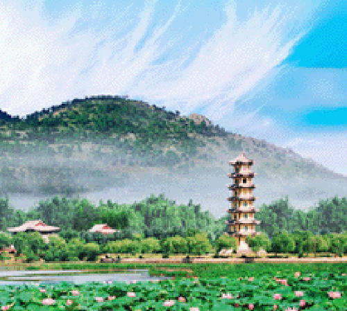 九頂蓮花山,橫看象一條巨龍逶迤騰飛。觀音閣高聳在蓮花山最高峰,巍峨莊嚴(yán),是求福求子的佛教道場(chǎng);登閣遠(yuǎn)眺,湖光山色,盡收眼底,小城春秋,一覽無余。山東麓,蒼松翠柏郁郁蔥蔥,火炬松濤香氣襲人;山西麓,林密徑幽清雅別致,栗園秋實(shí)碩果累累;大觀亭、鳳凰亭,亭亭玉立,攬勝閱春,風(fēng)光無限;一線洞天、鱷魚出水、猿人沉思、金鰲聽禪等景點(diǎn)情趣盎然。