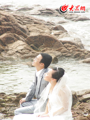 新人在海邊拍外景。