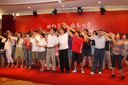 中新網青島8月26日電 26日中午,第五屆網絡媒體山東行采訪團繼續在青島考察采訪,當天適逢我國傳統節日七夕節,組委會在青島府新大廈舉行迎七夕活動,其間,來自全國各地的網絡媒體記者共同上臺,一起唱起那首熟悉的《明天會更好》,祝福偉大祖國的60華誕,祝愿祖國繁榮昌盛,人民生活幸福。