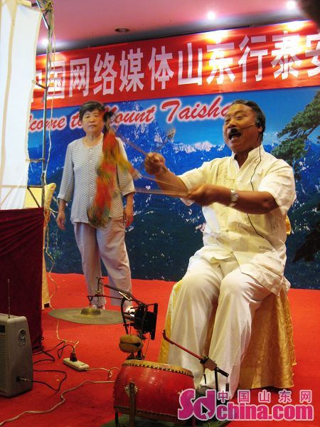 范正安為觀眾表演了泰山皮影戲的著名曲目《泰山石敢當》,表演過程中,但見老先生左腳踩鼓,右腳敲鑼,口中演唱,雙手指揮皮影,表情投入,跟著情節的變化,時而大笑、時而皺眉,一出泰山勇士石敢當勇斗妖怪的故事被表演得栩栩如生。