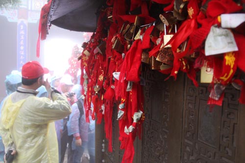 記者在泰山碧霞祠看到,祠堂里的道士們神情莊重地做著祈福迎祥道場,外面樹上掛滿了紅色的許愿簽,很多來自五湖四海的游客在這里祈福。