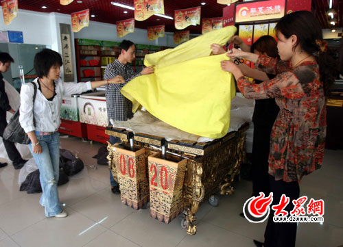 大眾網濟南5月4日訊(生活日報記者 楊黎明 大眾網記者 劉寶才 實習記者 隋喬)5月4日下午2點,山東濰坊的李濱先生提供的兩個奧運缶運抵濟南七里堡茶城。“擊奧運缶喝北川茶”,奧運缶將于明天在“北川茶愛心推介會”與廣大市民見面。