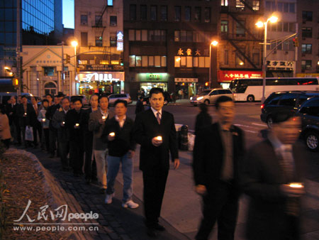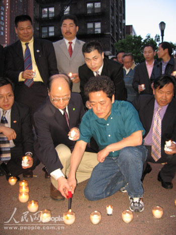 人民網紐約5月13日電 由美東華人社團聯(lián)合總會發(fā)起的紐約僑界悼念四川地震遇難同胞燭光追思會,13日晚間在華埠且林士果廣場林則徐銅像前舉行。數十位僑胞匯聚在白色蠟燭組成的"心"字前,悼念在四川地震中遇難的同胞,祝愿災民早日從災難中站起來,重建家園。美國福建同鄉(xiāng)會、美國福建公所、紐約和平統(tǒng)一促進會、紐約中華公所和美國上海聯(lián)誼會等僑團參加了今晚的燭光追思會。