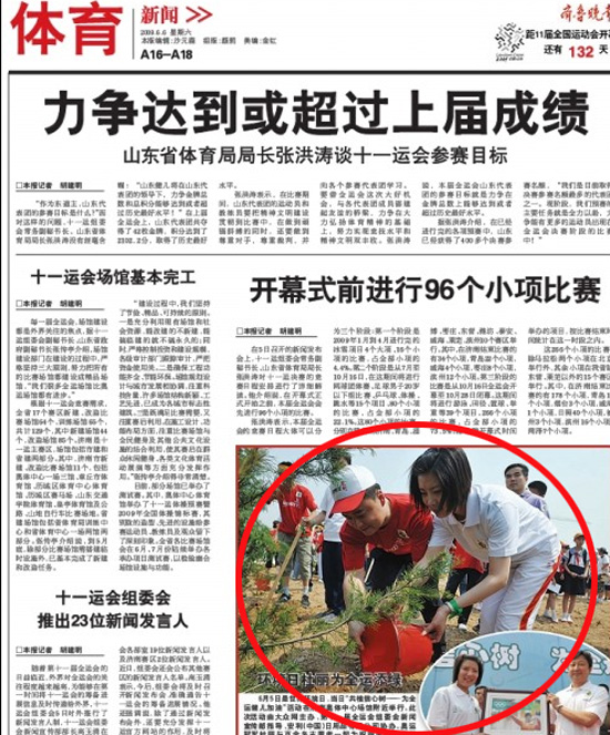 6月5日是世界環境日,當日“共植信心樹——為全運健兒加油”活動在濟南奧體中心場館附近舉行。此次活動由大眾網主辦、第十一屆全運會組委會新聞宣傳部指導、安利(中國)日用品有限公司協辦。奧運冠軍杜麗與百余名志愿者一起為祝福全運栽下了1100棵“信心樹”。齊魯晚報·生活日報副總編輯許志杰向杜麗贈送了本報記者在北京奧運會上為杜麗拍攝的照片。 記者 劉軍 攝
