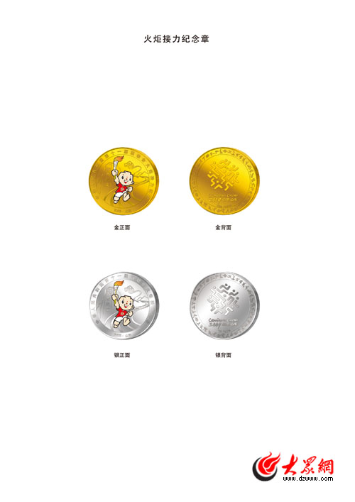 “火炬接力紀念章”采用99.99%純金及99.9%純銀打造,正面以十一運會吉祥物手持火炬奔跑為主要圖案,背景為泰山圣火采集的盛事景象;該產品設計大方典雅,制作工藝精良,紀念意義重大,發行量稀缺,為不可多得的收藏珍品。象征如意吉祥的“火炬接力紀念章”面向全國限量發行,中國民生銀行各營業網點及十一運會特許零售店均有售。