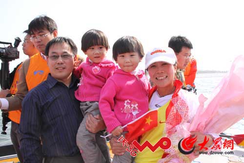 “媽媽、媽媽”山東隊果然不負眾望,第一個沖過終點,還沒等賽艇靠岸,3歲的笑笑和君君手捧著玫瑰花,在爸爸的帶領下,跑到登岸區大聲的呼喊。隊友們很配合,掉頭讓徐淼先登岸,接受女兒的慶賀。