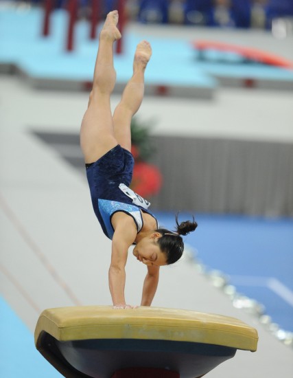 今晚的跳馬比賽實行兩跳記平均分的賽制。湖北隊的張業琳子第一個上場,盡管在第一跳中出現失誤,落地時沒有站穩,但第二跳張業琳子還是發揮得非常不錯,最終拿到13.000的分數。北京隊小將王欣第二個上場,兩跳王欣都發揮的非常穩定,得分13.900。接下來上場的是山西的鄧少婕,在第一跳中,鄧少婕發揮穩定,拿到13.950,但在第二跳中,鄧少婕在落地時出現失誤,摔出場外,拿到13.825分,最終拿到13.887。第四個上場的是在資格賽中排名第一的陜西隊楊佩。她兩跳都發揮得非常穩定,盡管第二跳在落地時稍顯不穩,但最終仍拿到14.237的分數,暫居第一。福建隊周巧紅第五個出場。第一跳周巧紅發揮非常出色,拿到14.550的高分,但第二跳中,周巧紅在落地時出現失誤,僅得到13.800,兩跳平均拿到14.175分。接下來出場的是來自香港的黃曉盈,兩跳平穩落地后,拿到13.312分。山東隊的史小璐第七個出場。第一跳,史小璐在現場觀眾的熱烈歡呼中穩穩落地,得到14.550的高分,第二跳穩定落地后,史小璐最終得到14.100的分數,位居第三。最后一個出場的是天津的蔣彤,最終拿到13.712分。
