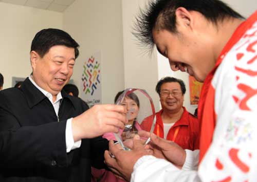省委書記、省人大常委會主任姜異康和男子三級跳遠前全國紀錄保持者鄒振先親切握手。(齊魯晚報記者 陳文進 郭建政 攝影)