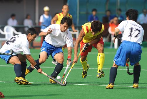 10月28日,內(nèi)蒙古隊球員在比賽中包抄遼寧隊球員董陽(右二)。當日,在第十一屆全運會男子曲棍球決賽中,內(nèi)蒙古隊以1比3負于遼寧隊,獲得亞軍。