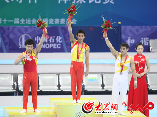 大眾網(wǎng)——山東聯(lián)通3G聯(lián)合報道(記者 閆明清 新婷 隋喬 爾印 洪棟) 9月18日晚上,十一運會體操男子個人全能決賽在奧體中心體育館開戰(zhàn)。經(jīng)過六輪的激烈角逐,最終北京選手滕海濱以89.35分問鼎金牌,川將馮喆89.1分屈居亞軍,摘得銀牌,江蘇選手呂博得到銅牌。山東隊的黃玉國、張成龍分別以88.150分和87.900分位居每四、第五名。